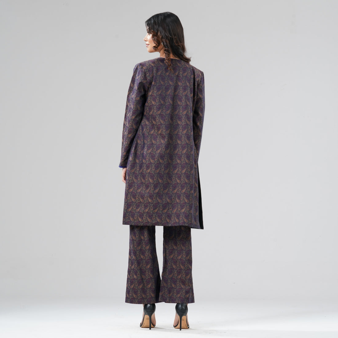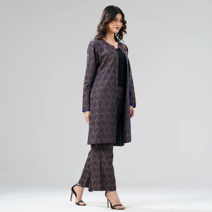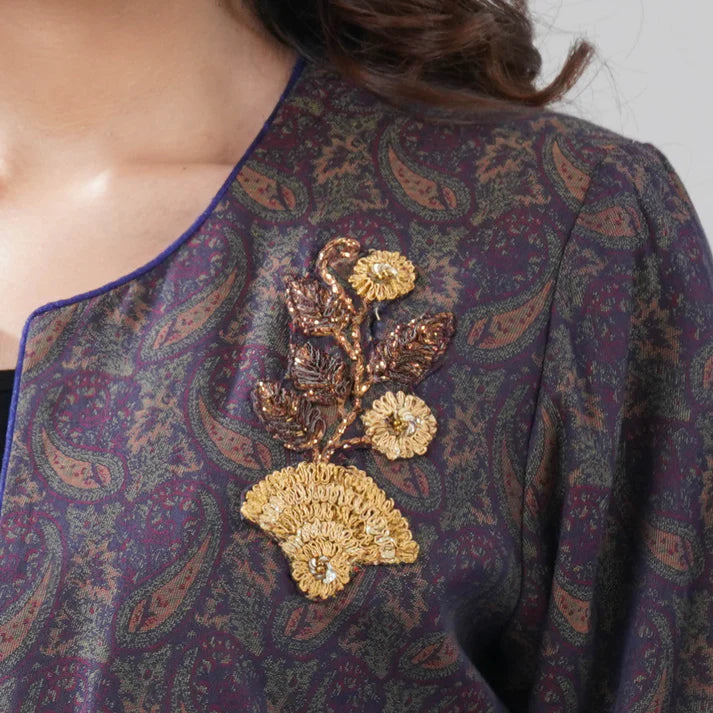 Elevate your festive style with this elegant womens navy ethnic two piece set, featuring a jacquard full-sleeve jacket paired with flared pants. The ensemble is beautifully embellished with ribbon work embroidery detailing, adding a refined traditional touch to your look. Perfect for special occasions and celebrations.